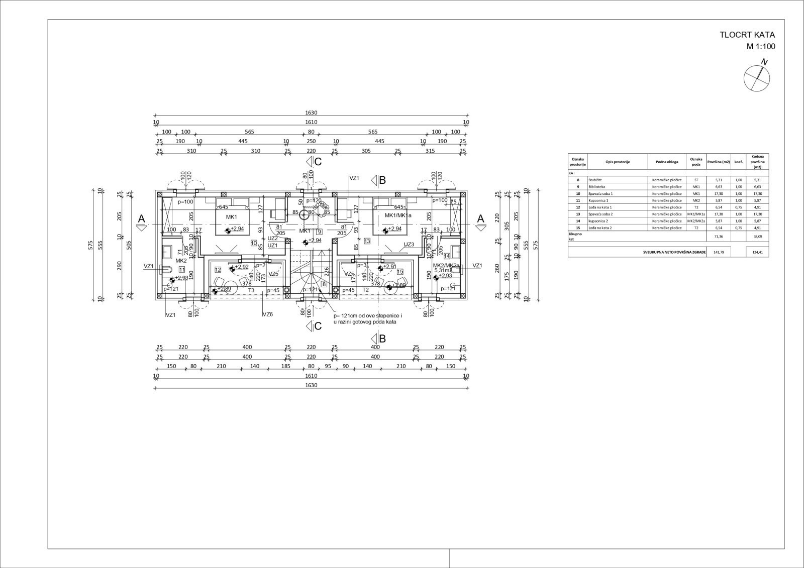 La casa, con una superficie di 140 m², si sviluppa su due piani. Al piano terra si trovano un bagno di servizio, una cucina, una sala da pranzo e un soggiorno con accesso al giardino di 250 m². Il giardino è predisposto per una piscina, mentre i locali tecnici e il ripostiglio hanno un ingresso esterno separato.